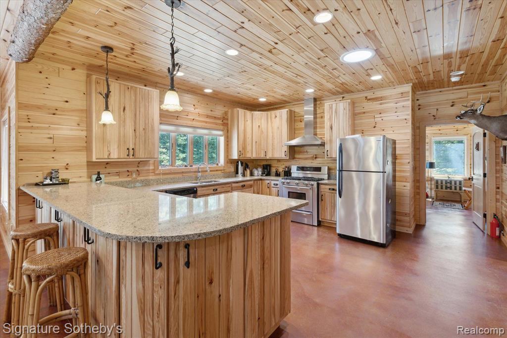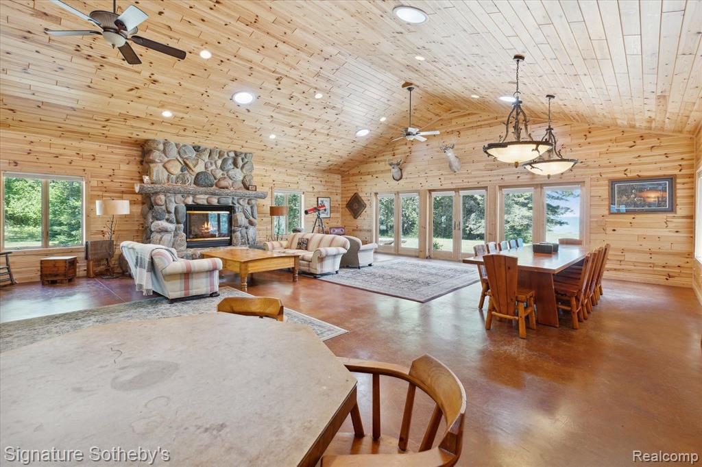 Few places in the world rival your own Lake Huron waterfront peninsula. With 710 acres, 3.5 miles of shoreline and 15 miles of drivable trails and roads. SUNUP Lodge is just that retreat. Come indulge in the beauty of a custom crafted hunting lodge in Alpena, MI. A rare opportunity exists for someone who wants seclusion & privacy that seamlessly blends functionality & artistry with a newer custom construction. A voluminous open layout made for entertaining, relaxing after a long cold day in the woods hunting, fishing or swimming/boating in Lake Huron. This private peninsula includes 710 acres w/18,480 linear feet on Lake Huron. 15 miles of drivable trails & roads. PURE MICHIGAN. A generous sized kitchen complete w/five gas burner stovetop & oven. Plus, an extra electric range oven conveniently located in the laundry rm. Great Rm which spans the kitchen space & large enough to accommodate 100 people. The Great Rm is 34 x 32 complete w/large custom crafted stone FP & a real tree log for the mantel. Gorgeous water view, front & center, when opening the French door from the front vestibule. Unique to this home is the knotty pine paneling both on the walls & ceilings throughout the whole home. Floors are radiant heat thruout 5 BR’s (1 is primary), & 3 full BA’s plus the essential pet shower conveniently located in the laundry rm. Onsite includes a 40 x 40 metal pole barn, 1600 sq ft, which holds the essentials for maintaining this site w/a Kuboto tractor, excavator, a 4 x 4, & other machinery. Solar panels, whole house 12K generator, 4 car carport for trailers, shed, propane & gasoline tanks, 15 hunting blinds, & a lovely patio w/log seating overlooking the water. Property is privately owned w/minimum usage each year & has been maintained by a professional maintenance person. All measurements are approx. Pre-qualified buyers & proof of funds required before appts are confirmed. Parcel ID’s included in the sale: 01600100025100, 01403600000100, and 0160060004000.BATVAI |