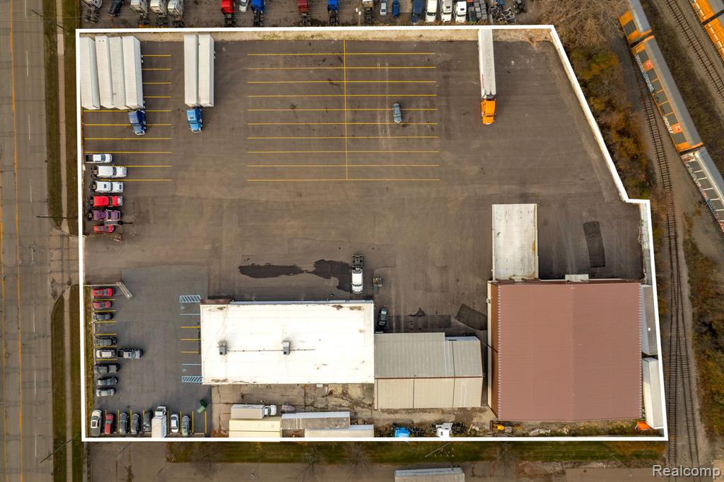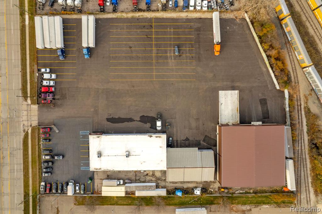 The property includes a 10,500 SF warehouse, 5 service bays for semi-truck repairs, dedicated truck parts inventory areas, and brand-new paved parking accommodating approximately 60–70 truck trailers.